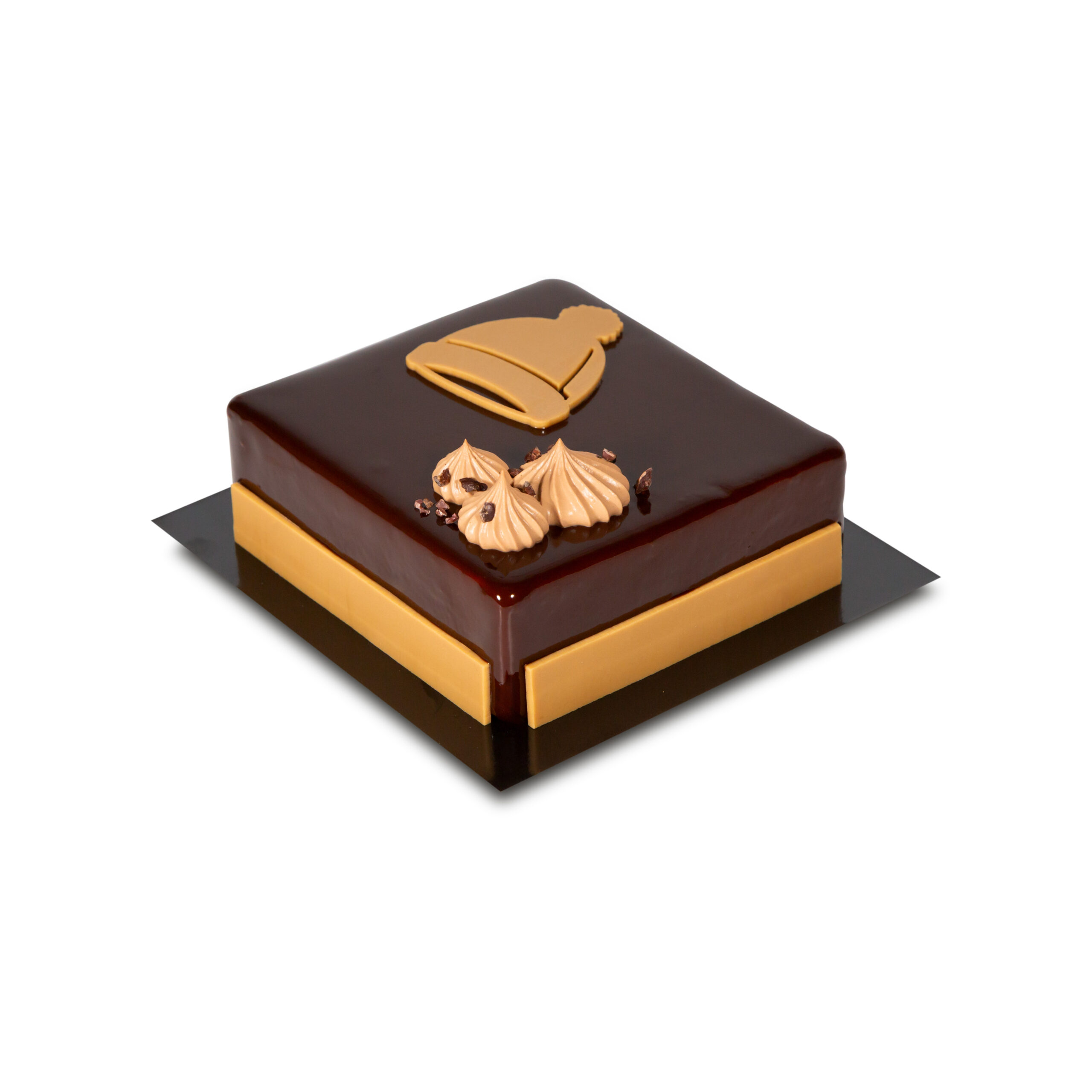 Chocolate fondant cookie with crunch, 42% milk chocolate mousse, 65% Grand Cru dark chocolate mousse, chocolate glaze