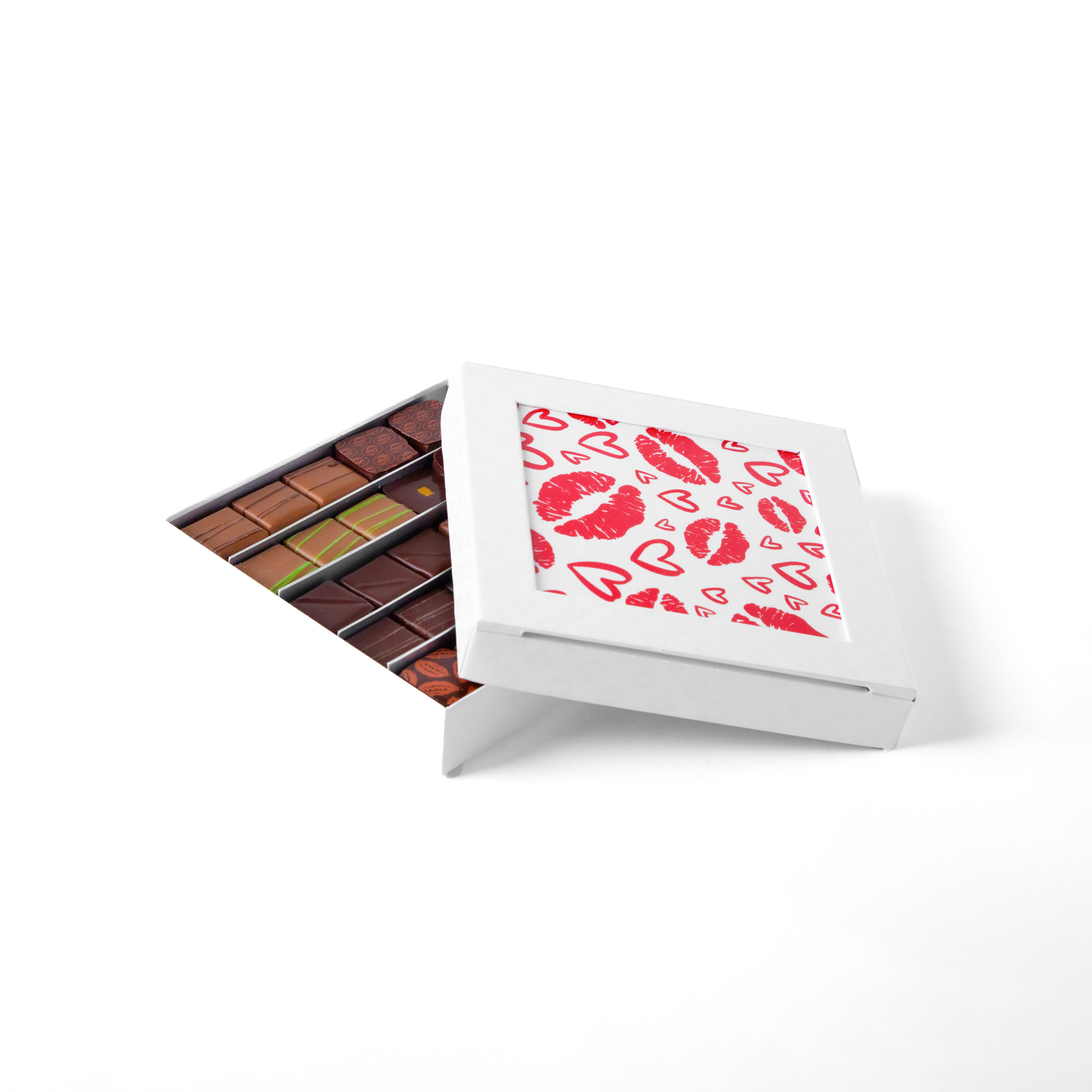 Ingredients: Cocoa mass, cocoa butter, sugar, CREAM, anhydrous BUTTER, whole and skimmed milk powder, coffee extract, lemon, passion fruit, raspberry, PISTACHI, almonds, hazelnuts, cinnamon, ginger, FRUIT flour, coconut oil, rapeseed oil, emulsifier (SOJA and rapeseed lecithin), salt, coloring (E100, E133, E172, E151), spices.