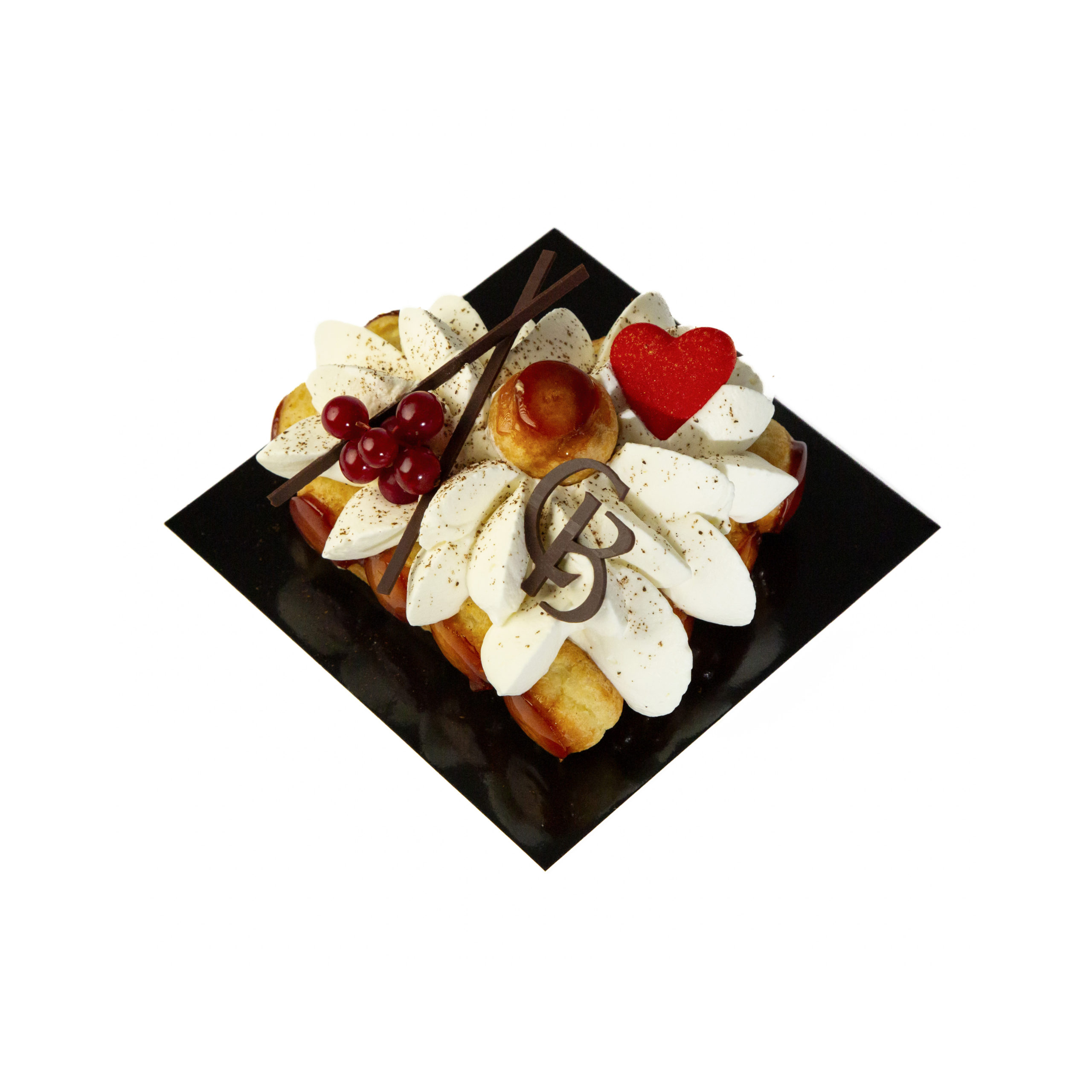 Puff pastry, choux pastry, vanilla diplomat cream, vanilla whipped cream, chocolate chips, redcurrant.