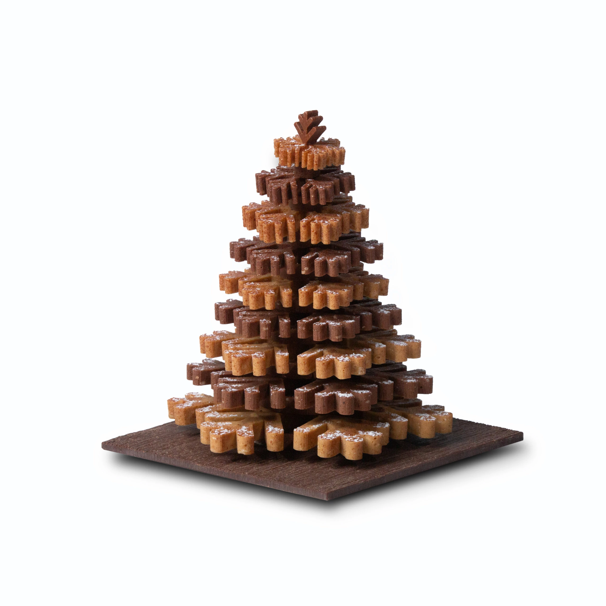 Ce sapin gourmand, composé de gianduja aux amandes, est construit à partir de branches empilées en forme de flocon de neige. Son design moderne ajoutera une touche élégante à votre table.