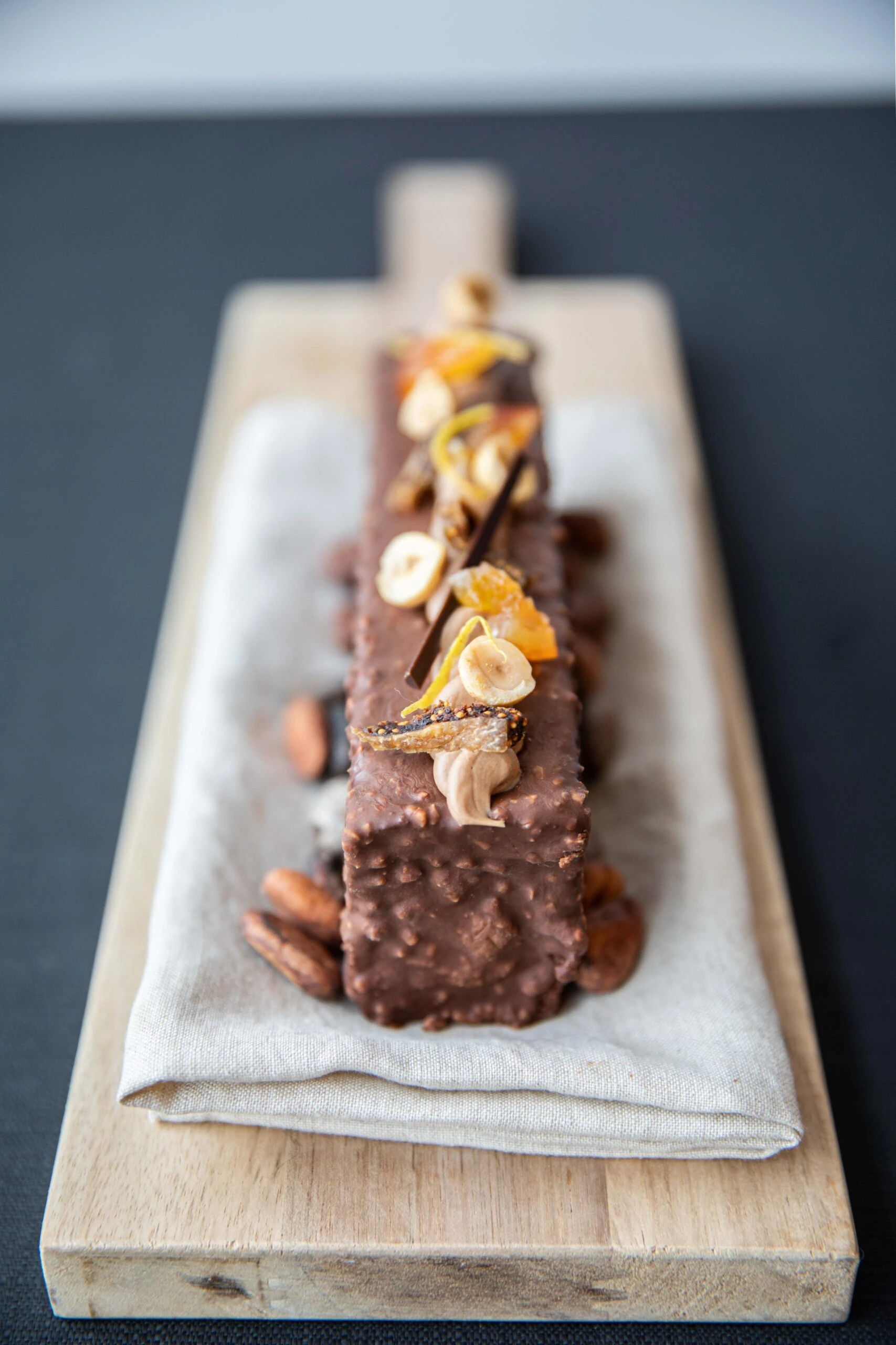 Ingrédients : Sucre, amandes en poudre, noisettes, beurre, farine de froment, oeufs, fève de cacao de Madagascar, crème, pâte de cacao, cacao en poudre, maltodextrine, lait écrémé en poudre, beurre de cacao, graisse de coco hydrogénée, fève de cacao écalée, émulsifiant (E471, E322), agent levant (E450i), sel de cuisine.