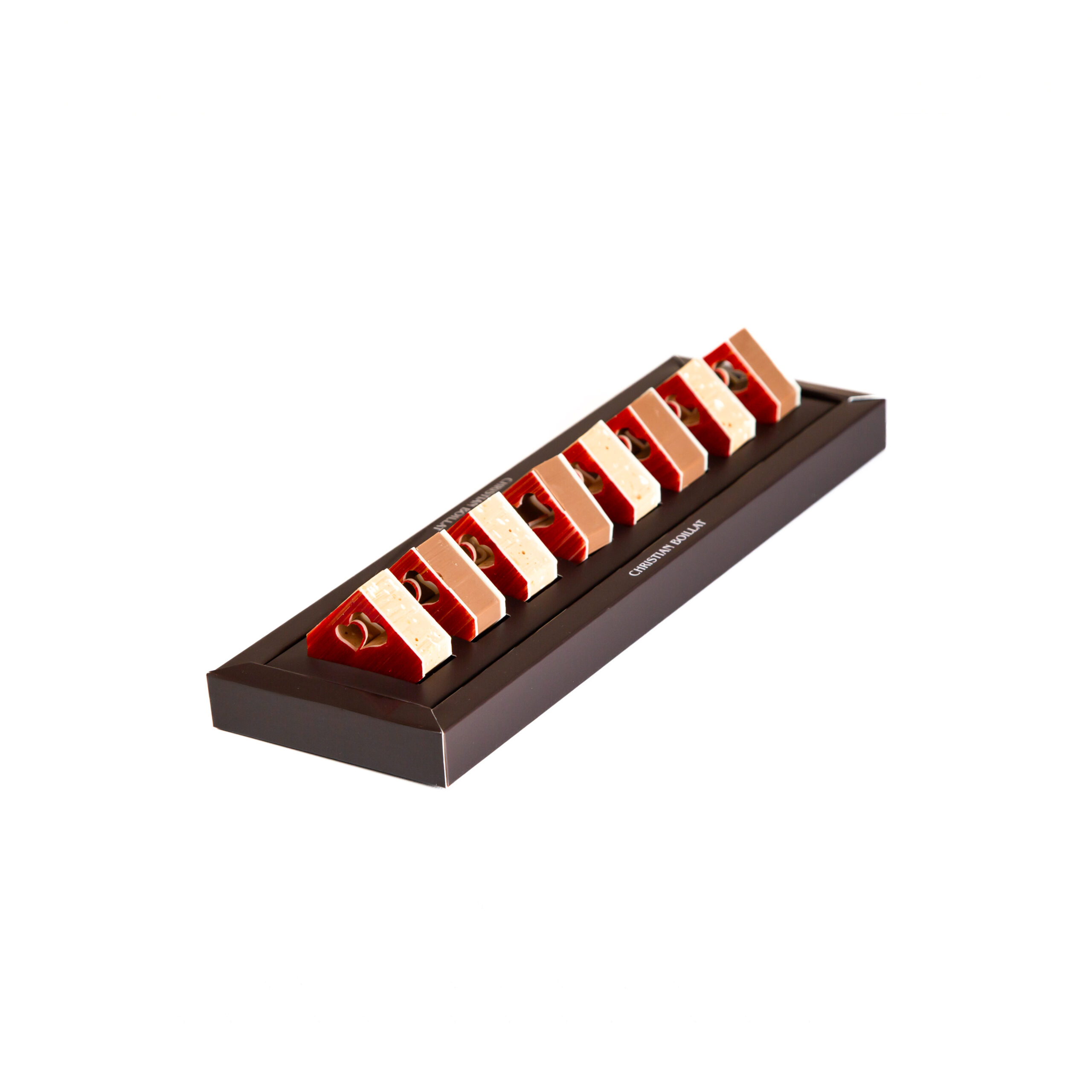Ingrédients : sucre, AMANDES, NOISETTES, pâte de cacao, beurre de cacao, glucose, miel de fleurs, LAIT ÉCRÉMÉ EN POUDRE, LAIT ENTIER EN POUDRE, poudre de cacao, BLANC D’OEUFS, émulsifiant (lécithine de SOJA et tournesol), sucre en poudre, amidon de maïs cireux, dextrose, vanille, colorant E174, E129.